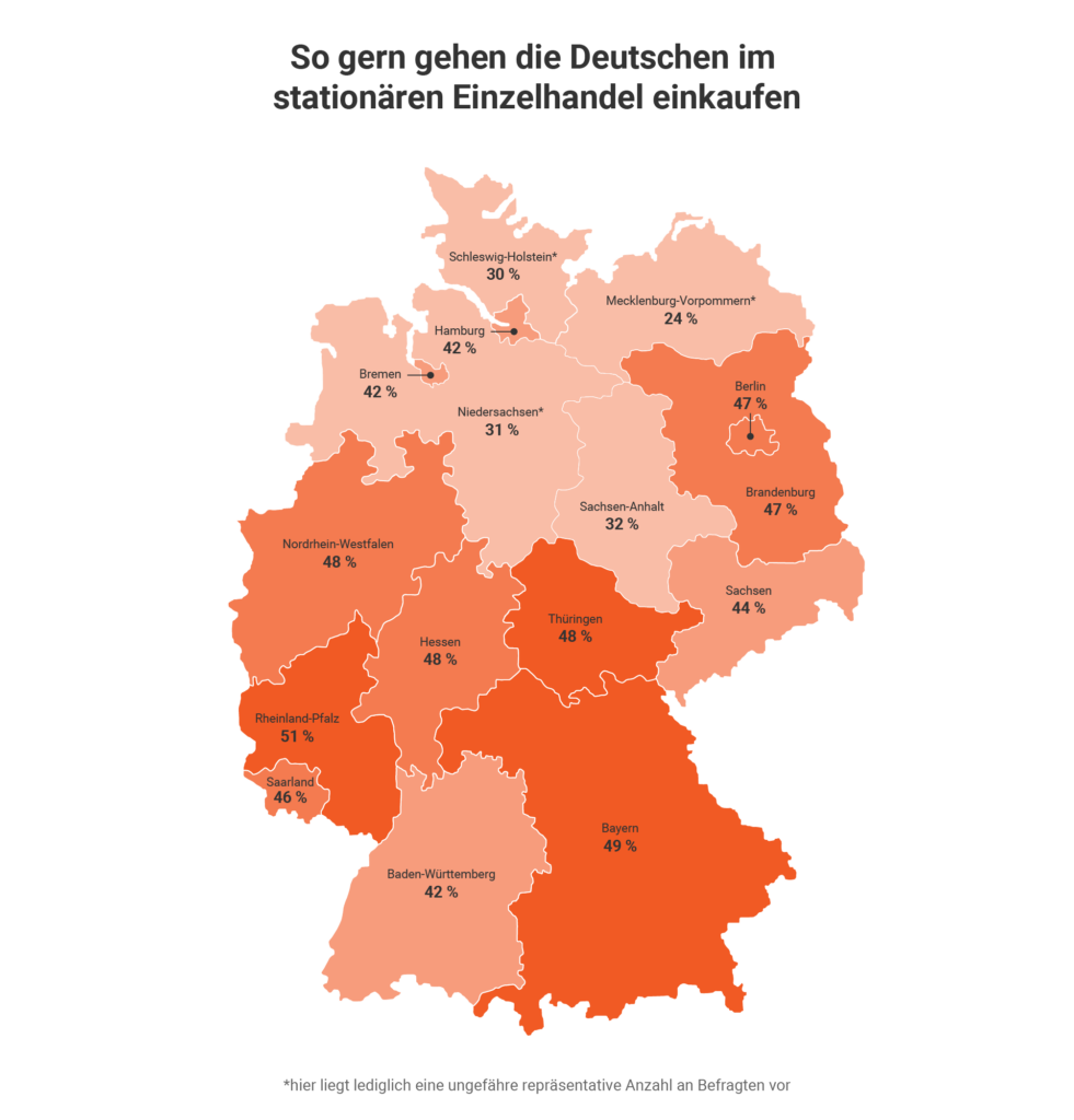 Auf Bundeslandebene gehen vor allem die Einwohner in Bayern, Rheinland-Pfalz und Thüringen gerne im stationären Einzelhandel einkaufen.